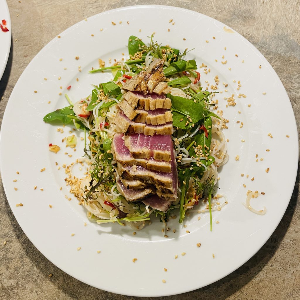 - Heat a non stick pan to medium/hot and sear the tuna on both sides for 2 minutes, and seal edges too. Remove from the pan and carefully slice, ready to sit on top of the noodles.
