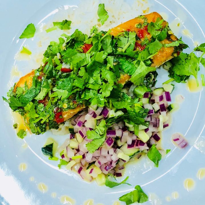 Garlic, Honey & Chilli Baked Salmon with Cucumber & Red Onion Relish Fish, Mid Week Meals Garlic, Honey & Chilli Baked Salmon with Cucumber & Red Onion Relish